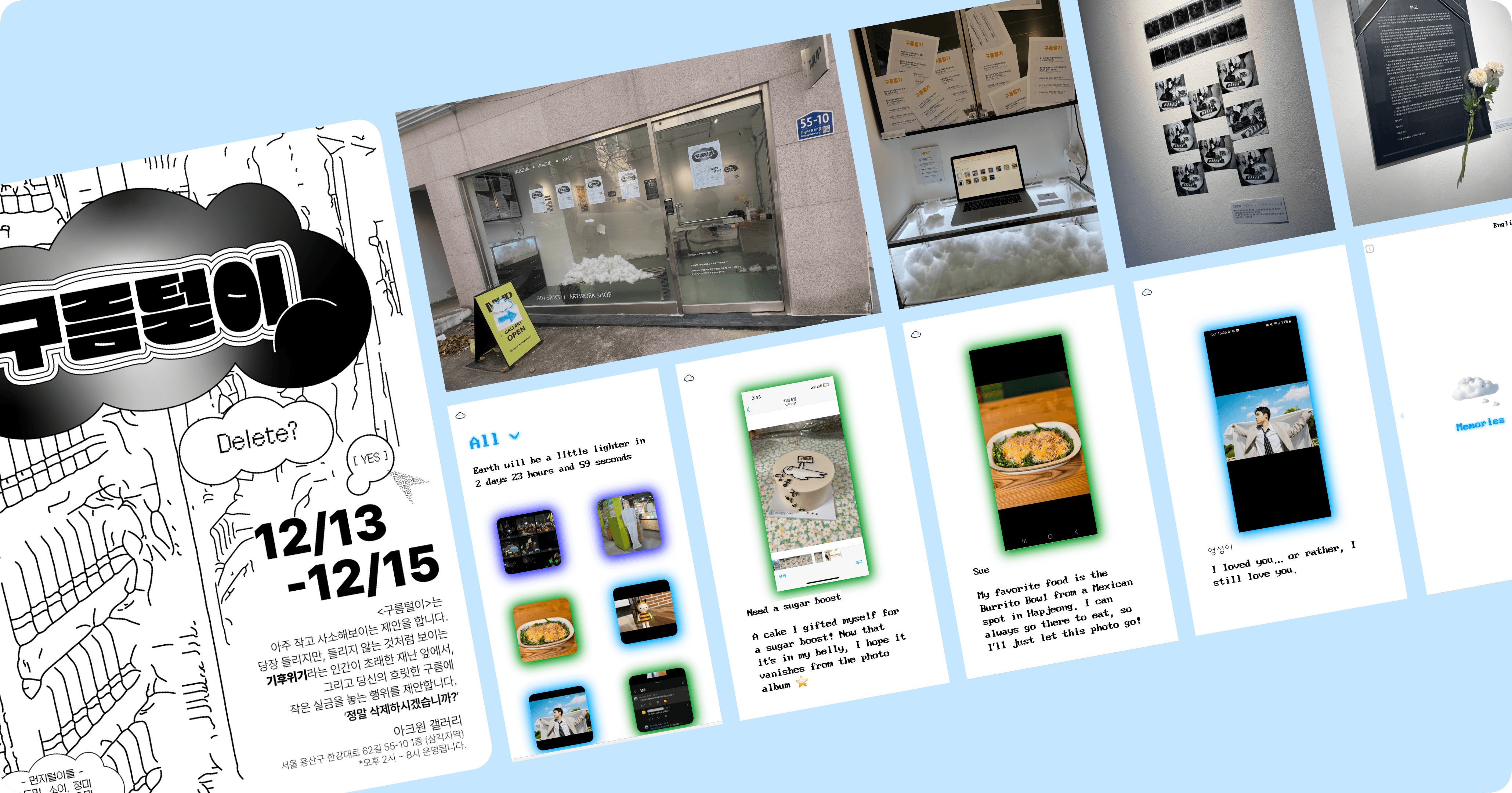 To culminate our project, we brought the "Cloud Duster" into a physical exhibition, transforming our digital concept into a tangible, real-world experience. The space featured live projections of shared memories and an interactive booth, sparking conversations about the hidden weight of our digital lives.